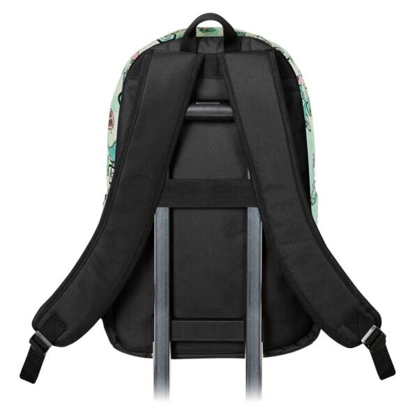 Mochila escolar de un compartimento. Cuerpo exterior con dos bolsillos laterales en malla, correas al hombro acolchadas y banda trasera para trolley.